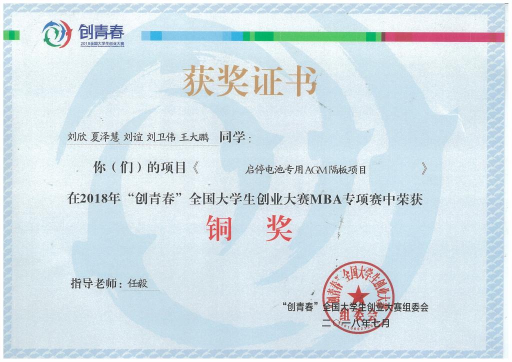 7月12-15日,由共青团中央、教育部、人力资源和社会保障部、中国科协、全国学联、浙江省人民政府主办,共青团浙江省委、金华市人民政府、浙江师范大学承办的2018年“创青春”全国大学生创业大赛MBA专项赛在浙江省金华市举行终审决赛。我校创业项目“启停电池专用AGM隔板项目”在比赛中发挥出色,斩获全国铜奖。