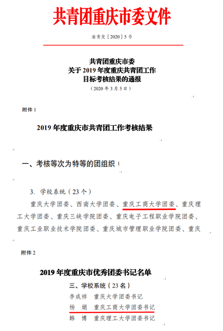 2020年3月5日,共青团重庆市委下发了《关于2019年度共青团工作目标考核结果的通报》(渝青发〔2020〕5号),我校在2019年度重庆市共青团工作目标考核中荣获特等奖。杨娟同志被评为“2019年度重庆市优秀团委书记”。