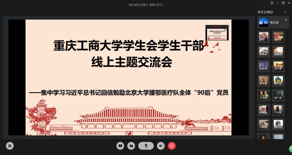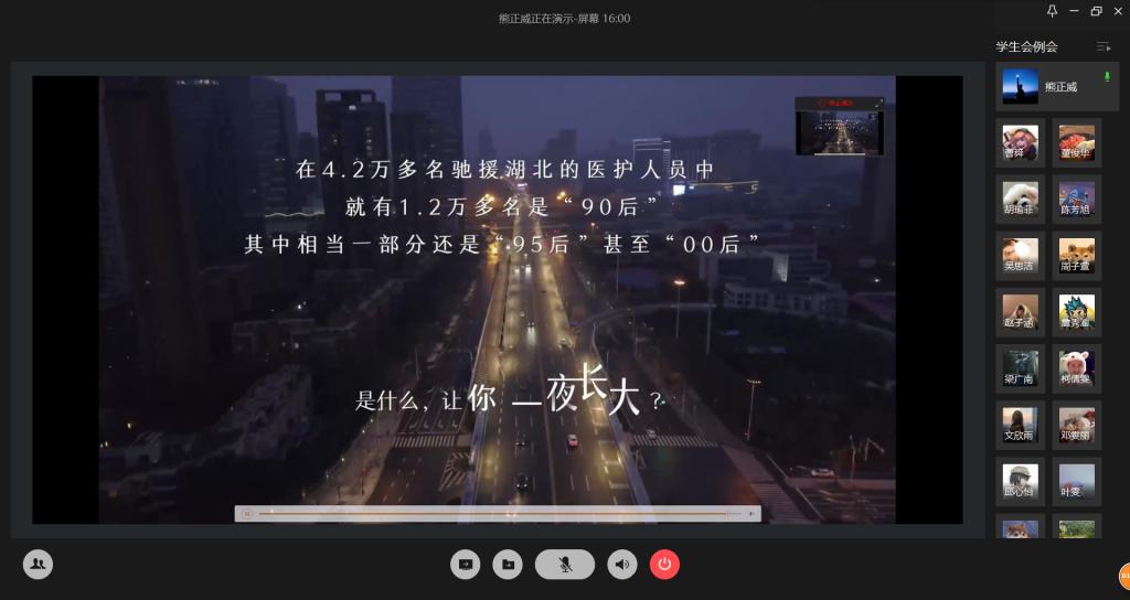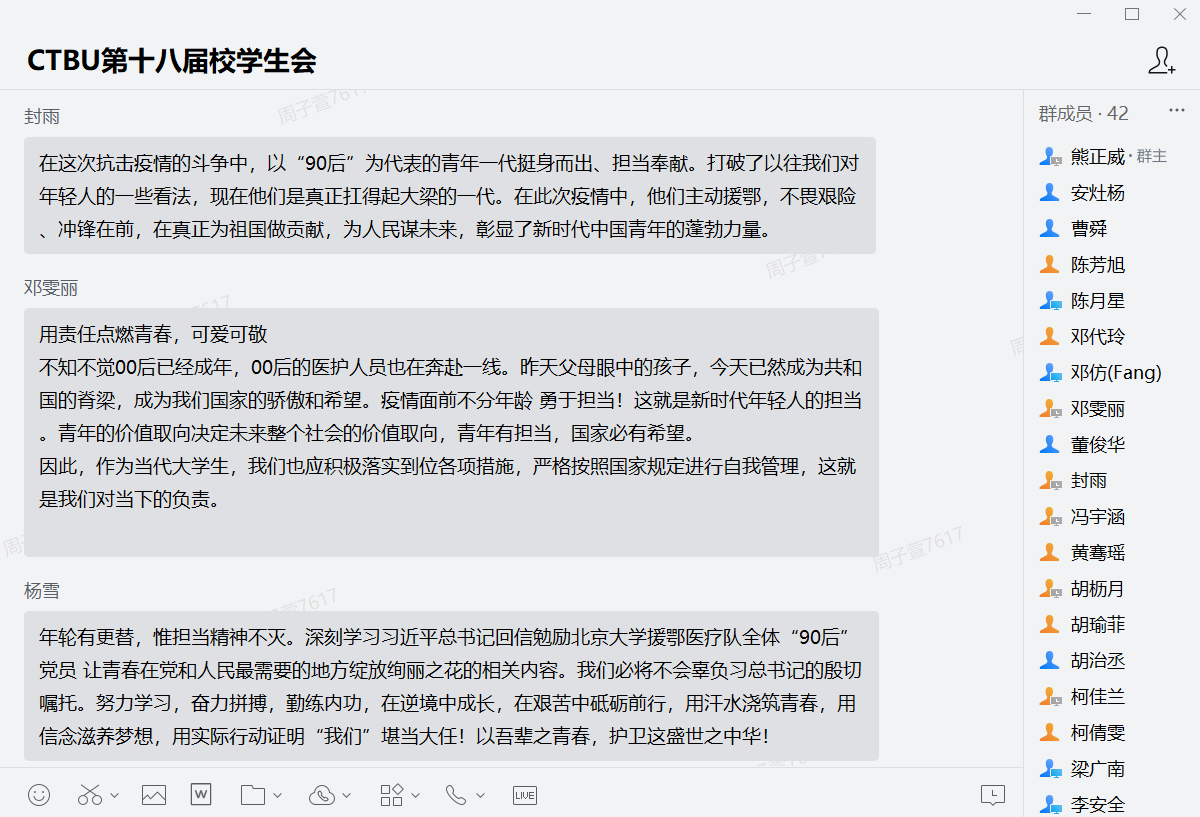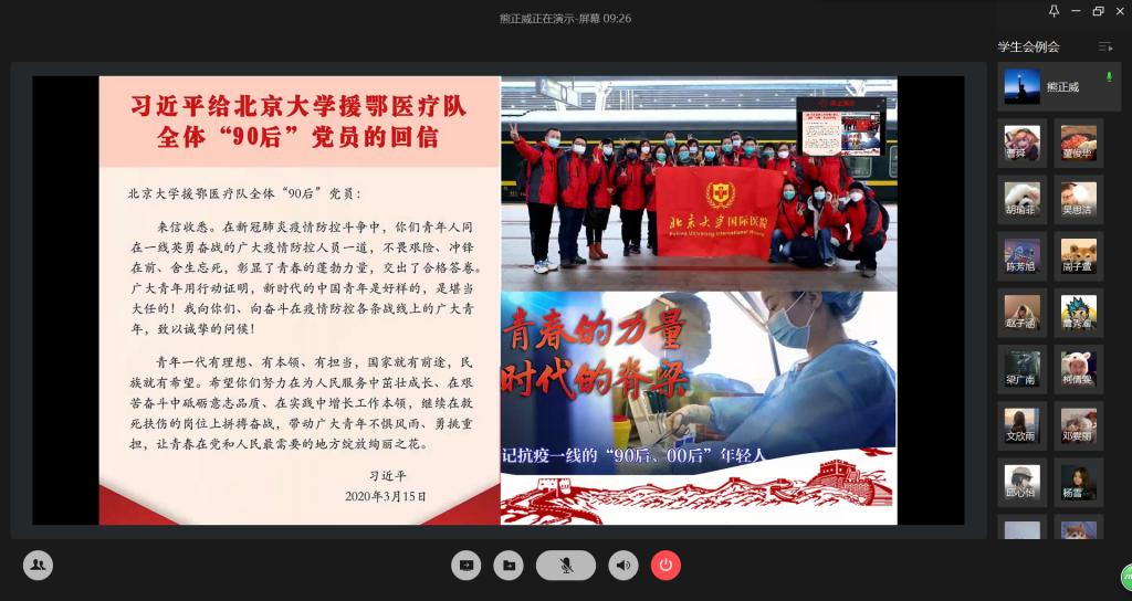 3月24日12:30,校学生会在企业微信平台上集中学习《习近平总书记给北京大学援鄂医疗队全体“90后”党员的回信》。