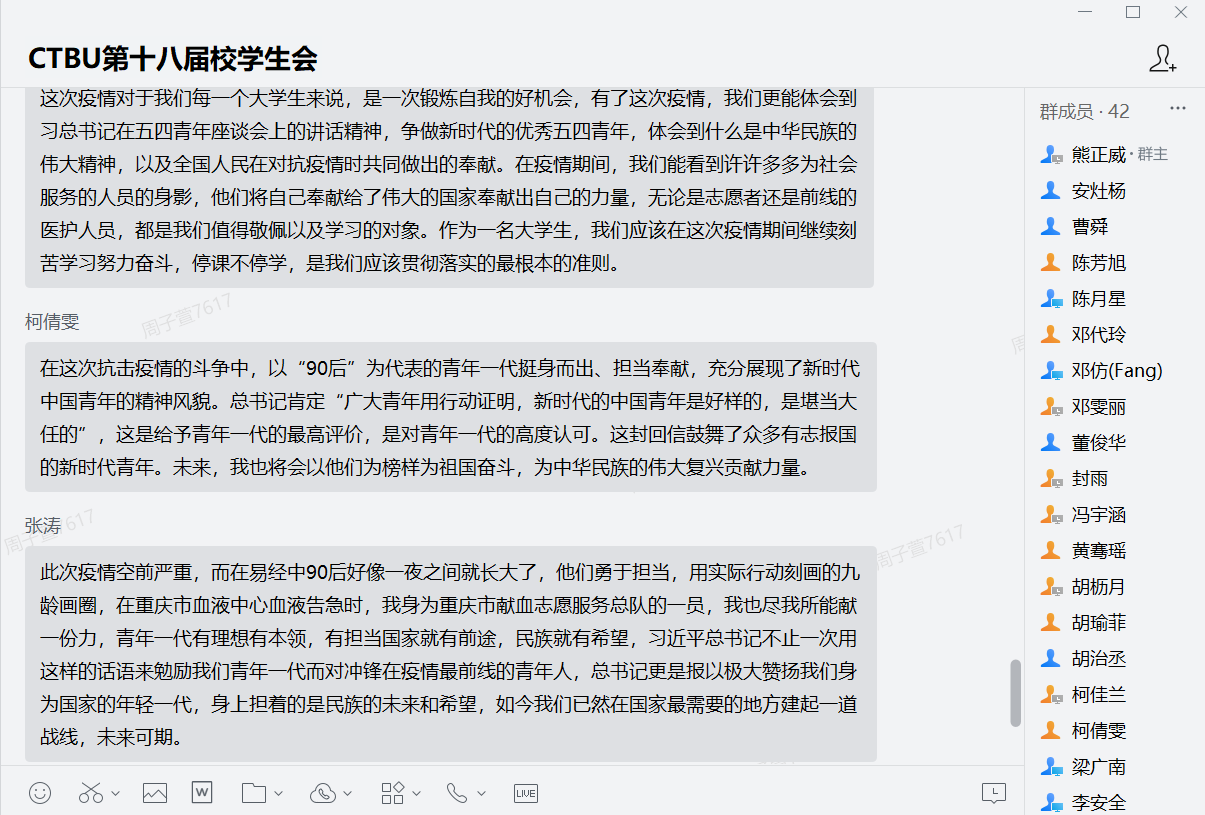 会议伊始,熊正威同学领学总书记回信。他在感受中说到,习总书记在回信里提到,广大青年用行动证明,新时代的中国青年是好样的,是堪当大任的!作为一名学生干部,在疫情期间要勇于担当,奉献自己的一份力量,同时要严格要求自己,发挥示范引领作用,做到学习、工作两不误。陈月星同学谈到,面对新冠肺炎疫情,我看见无数青年奔赴新冠肺炎疫情防控一线,他们当中有医生,护士,警察,快递小哥,社区干部,环卫工人等等,他们每个人都是我们学习的榜样,他们用火热的青春温暖着整个华夏大地。总书记曾说过,青年一代有理想,有本领、有担当,国家就有前途,民族就有希望。作为大学生的我们,也应该勇挑重担,不辜负党和国家的希望,在每一个祖国需要我们的角落扎根,发芽,绽放绚丽之花,和千千万万的青年同胞们共同实现中华民族伟大复兴的中国梦而努力奋斗。文欣雨同学说道,在抗击疫情的斗争中,以“90后”为代表的青年一代挺身而出,这些“90后”用实际行动镌刻着属于他们这个年代的印记。吴思洁同学感叹到,“90后”在艰难险阻面前没有被击倒被压垮,因为祖国是我们坚强的后盾。我们相信,党中央一定会团结领广大人民群众取得抗击新冠肺炎疫情的全面胜利。胡枥月同学认为,想要建设更好更强的中国,每一个青年都需认识到自己肩上的责任……与会成员积极发言,表达出勇担责任,不负韶华,砥砺前行,为祖国贡献青春力量的信心与决心。