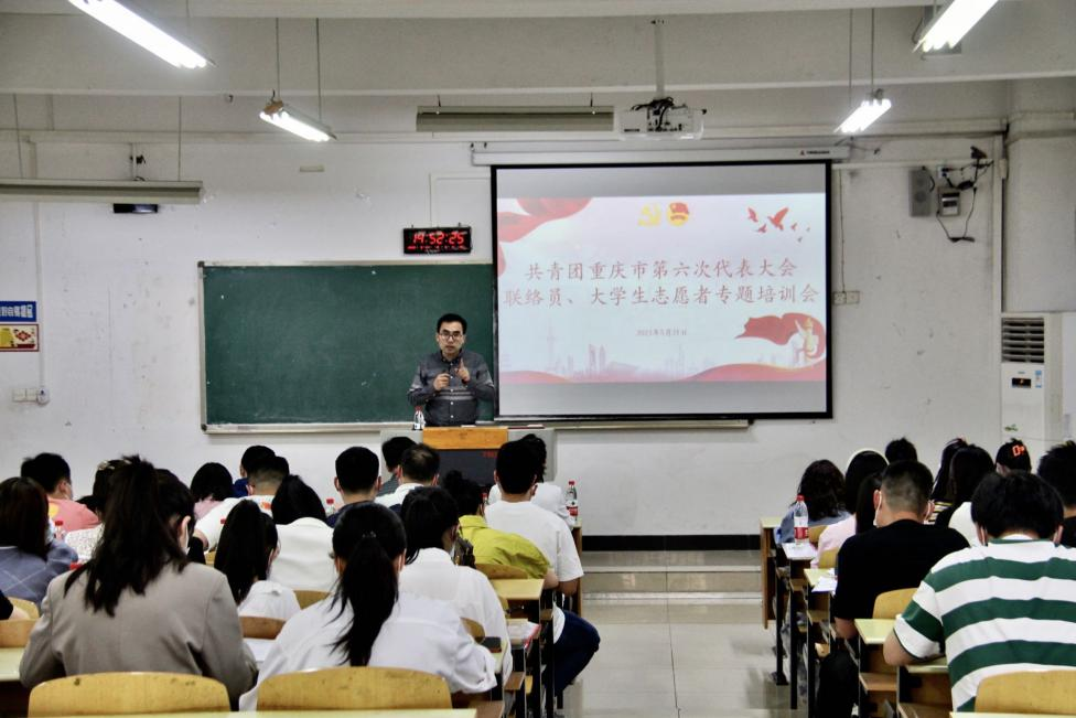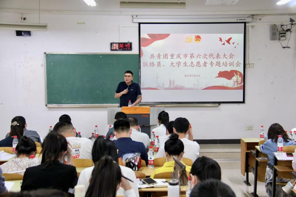 共青团重庆市第六次代表大会将于近期隆重召开,为确保高标准、高质量、高水平完成共青团重庆市第六次代表大会各项工作任务,5月21日下午,市第六次团代会联络员、大学生志愿者专题培训会在我校江北校区宏智楼B107教室顺利举行。团市委高校工作部部长潘毅、团市委办公室副主任辜磊、市青年创新创业服务中心副主任郭伟、团市委高校工作部老师齐继东、我校团委副书记胡婧婷出席培训会。市第六次团代会联络员、承担本次团代会志愿服务任务的重庆工商大学志愿者及带队老师共计60余人参会。