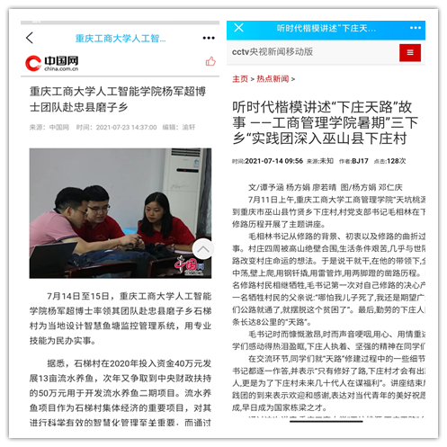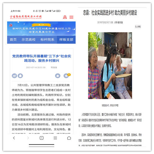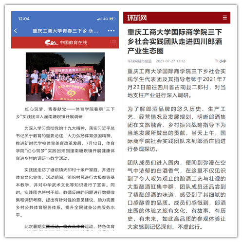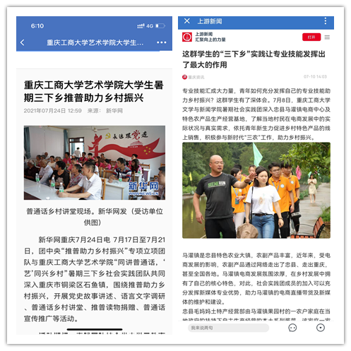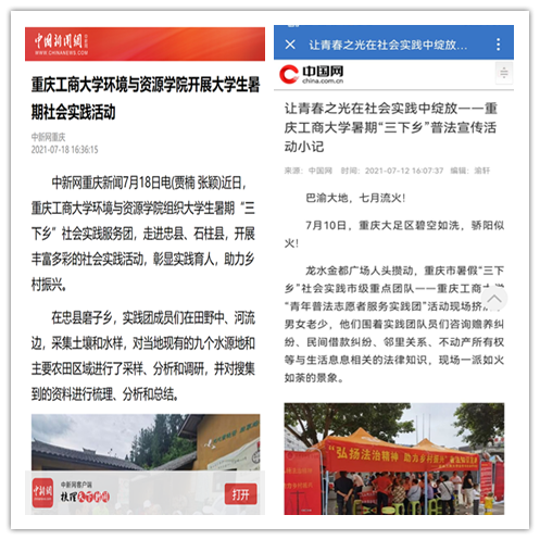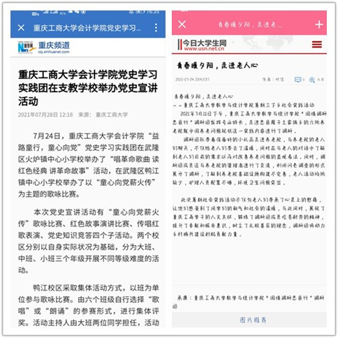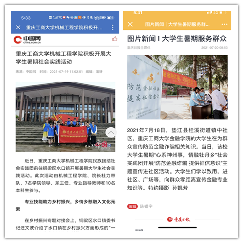 在实践活动期间,各学院创作多种类型的高质量社会实践作品,如《益路童行,童心向党--重庆工商大学会计学院党史学习实践团在支教学校举办党史宣讲活动》、《重庆工商学子赴古蔺县 看贫困户"搬"出幸福新生活》、《返乡创业敢为先 乡村振兴正当时——重庆工商大学经济学院助力乡村振兴在行动》、《脱贫不忘来时路,乡村振兴靠大家——重庆工商大学工商管理学院暑期“三下乡”实践团深入重庆市巫山县下庄村》等,引领广大青年学生在扎根中国大地的生动实践中增强“四个意识”、坚定“四个自信”、做到“两个维护”。实践团深入乡村基层,走访调查,理论宣讲,服务社会,在社会实践的亲身经历中受教育、长才干、做贡献,得到了当地群众及社会的认可,同时实践活动也被《新华网》、《人民网》、《中国青年网》、《央广网》、《中国网》、《中视网》、《重庆晚报》、《上游新闻》、《中国教育在线》等多家媒体报道。