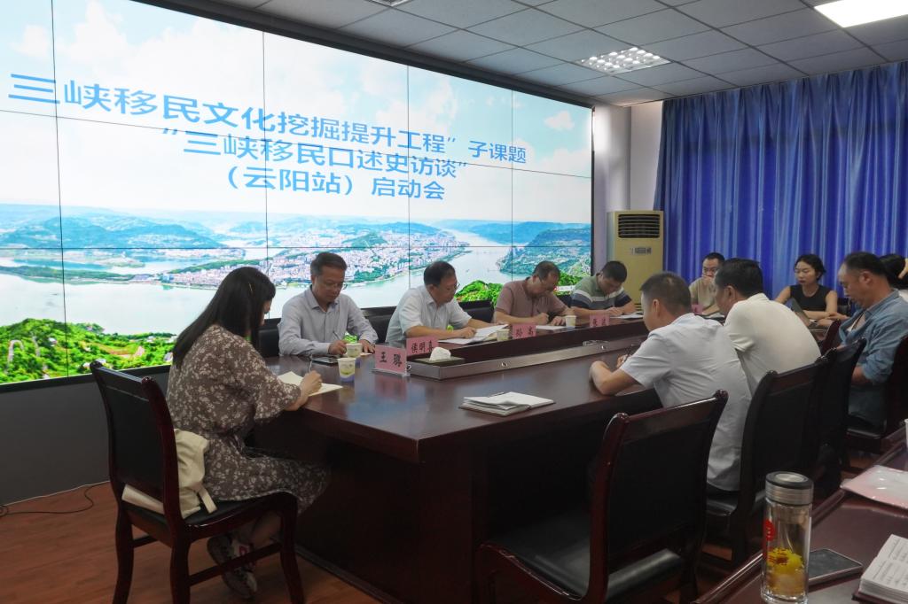 7月12日,“三峡移民文化挖掘提升工程项目”子项目——“三峡移民口述史”(云阳站)暨重庆工商大学三峡移民文化挖掘提升工程调研团工作启动会在重庆市云阳县水利局会议室召开。我校党委常委、副校长张波,法学与社会学学院副院长侯明喜,法学与社会学院专任老师张东博士、袁博博士、王璐博士、王茹薪博士以及十余名研究生调研团成员参会。会议由云阳县水利局党委委员、副局长孙高主持。