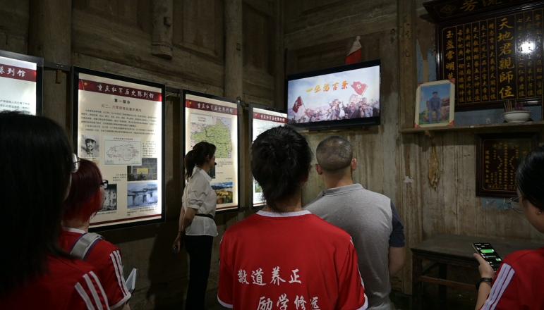 本团队经过五个多小时的跋涉,于7月8日中午抵达黄家镇。简单整顿后,团队成员跟随先锋社区负责人王正琴的脚步,来到了红军历史陈列馆。负责人为团队成员详细介绍了红七师机炮连一排与黄家镇的军民鱼水情——“一张留言条”的历史渊源。在彭水黄家镇,村民黄学珍家的门板上贴着的泛黄纸条上写着,“老板:我们吃了你半坛咸菜几根大葱,烧了几根柴,共补你黄豆六升”。
