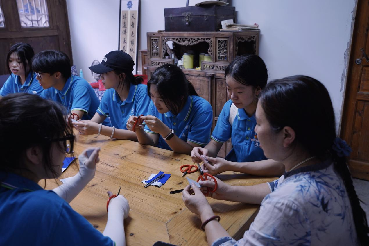 传承团成员在深入调研之后,还亲身体验了非遗剪纸制作的全过程。从折叠纸张、剪出基本形状到细致雕琢每一个小细节,一步步掌握了剪纸的基本技巧。一张张天青色剪纸在传承团成员的手中逐渐成型,散发出独特的艺术气息。这次体验不仅让传承团成员深刻感受到了剪纸艺术的精妙之处,进一步激发了同学们对传统文化的热爱与尊重。
