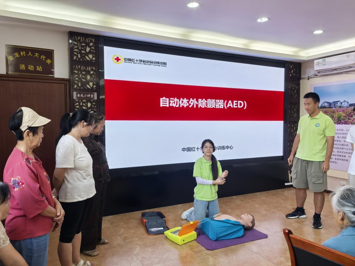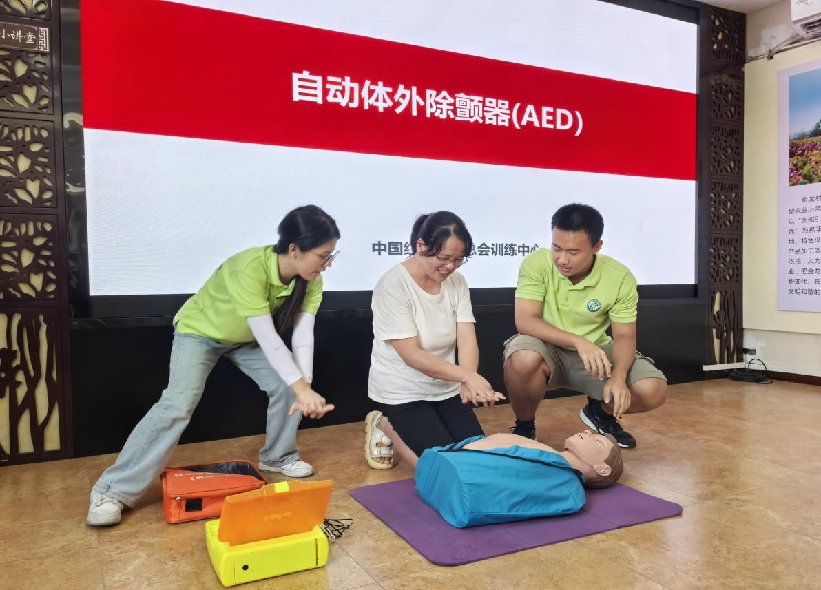 为确保培训效果,“小红馨”团队提前一周筹备,针对乡村常见急症,设置了心肺复苏术(CPR)、气道异物梗阻急救、自动体外除颤器(AED)操作三大核心教学模块。课程采用“口诀记忆法”“情景模拟法”等适老适幼的方式,并配备心肺复苏模拟人、婴儿急救模型及AED训练机等教具,营造沉浸式学习环境。