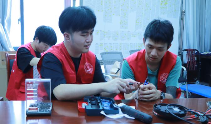 7月7日下午至9日上午,实践团在万新社区党建服务中心设立义务维修点。居民们纷纷送来电风扇、电饭煲、电热水壶、电磁炉、收音机等故障电器。队员们运用电子电路知识和智能检测技能,耐心排查故障,精准维修,现场成功修复电器26件。维修点前,人流不断,“这些大学生技术过硬,我的三十年老古董电风扇又可以转了!”社区居民王阿姨拿着修好的电器赞不绝口。