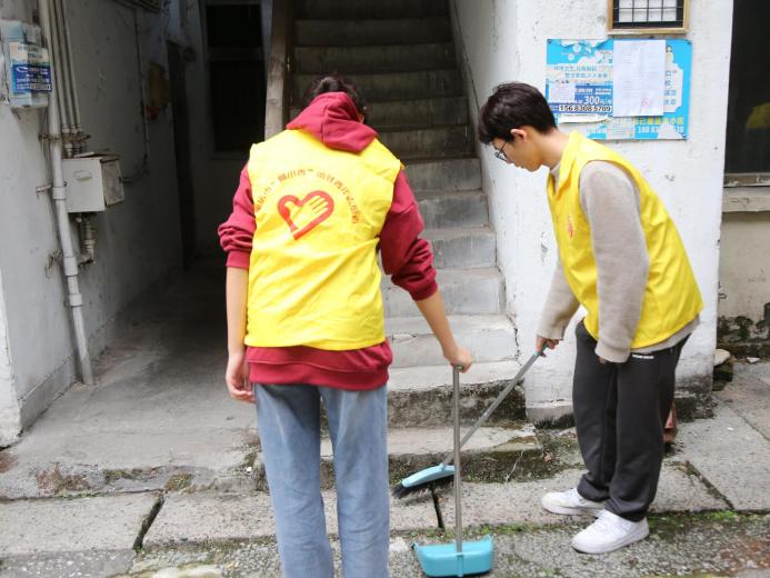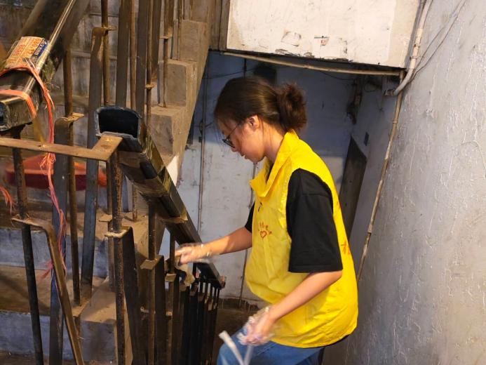 活动伊始,活动负责人们对志愿者进行排组与任务划分,保障活动井然有序的进行。志愿者们依次领取工具,正式开始清洁。活动过程中,志愿者辛勤的汗水播撒在每个楼栋与街道。看楼栋,有的志愿者用抹布擦拭扶梯;有的志愿者用扫把扫去浮尘;还有的志愿者高举扫把拂去蛛网。看场外,一名名“黄马甲”穿梭在条条小路上,洒扫街道,清理垃圾。霎时间,老旧的楼栋一尘不染,交错的街道焕然一新。