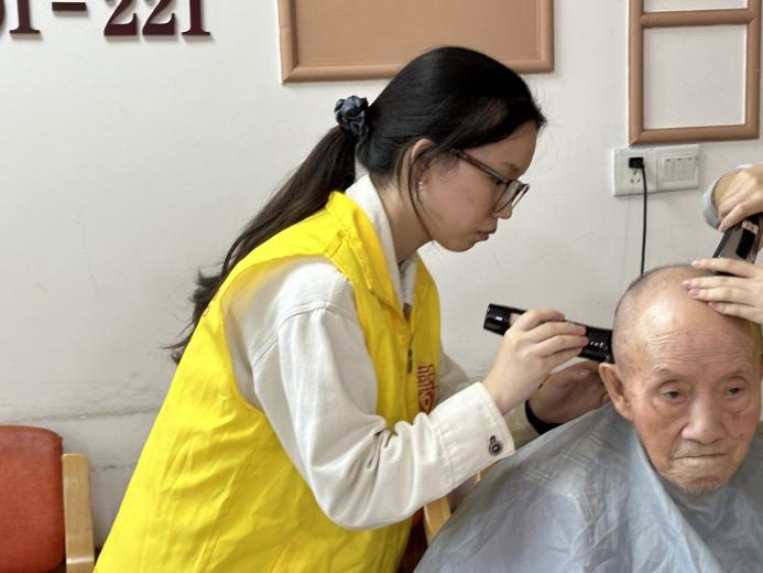 活动伊始,志愿者们换上马甲,拿起工具,投身到这场温暖人心的活动中。他们或是牵起老人双手,有条不紊地为老人们修剪指甲;或是轻弯腰,稳抬手,为行动不便的老人喂食饭菜。缕缕夕阳洒下,熠熠生辉的是志愿者们充满爱的双眼与老人慈祥的笑容,这些点滴共同组成了一幅温馨的画卷。随后,志愿者们前往二楼进行下一项工作——为老人理发。志愿者们拿起理发器,为老人们整理发型。望着老人们焕然一新的造型,志愿者露出幸福的微笑。每一次修剪,不仅有做事勤恳的细心,更有敢于尝试的勇气,让爱在指尖传递,让爱在心中流淌。