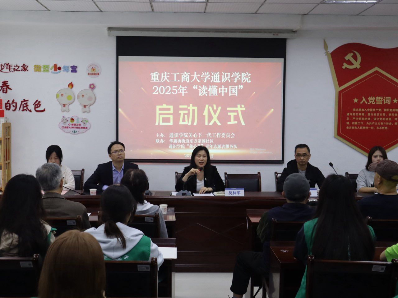 为强化校社联动合作,深入推动关工委“读懂中国”活动的开展,4月25日,我校通识学院“蒲公英”青年志愿者服务队组织大学生志愿者深入江北区华新街道东方家园社区,在东方家园社区党群服务中心会议室联合主办“读懂中国”活动访谈启动仪式。东方家园社区党委书记吴林军、我校通识学院专职组织员宫彪、东方家园社区“五老”受访代表作为嘉宾出席活动,20余名志愿者参与此次活动。