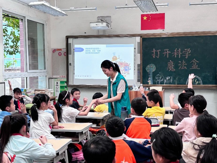 活动当日,志愿者分年级同步推进趣味课程,依托垃圾分类科普讲堂、非遗剪纸工坊、情景沉浸式戏剧等多元形式互动模块,激发少年儿童参与热情,启发独立思考能力,系统构建文化认知体系,领悟古诗艺术精髓,零距离触摸文化根脉,全方位激活学习内驱力。活动现场,少年儿童争先恐后分享见解,全神贯注投入思考,积极抢答互动交流。课程尾声,志愿者与孩子们执手相庆,定格珍贵教育瞬间。