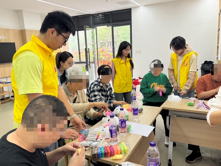 本次活动分为三个环节。第一环节中,志愿者组织残疾人开展拍手操训练。志愿者按照标准化教学流程,示范拍手、摆臂等动作,带领残疾人完成健身活动;第二环节中,志愿者为残疾人提供彩笔、彩泥、捏捏棒等制作材料,指导其完成面具DIY创作。从图案设计到装饰制作,志愿者全程提供帮助,鼓励残疾人发挥创意;第三环节中,志愿者协助专业心理咨询师,围绕残疾人常见心理问题,通过设置情景演绎,向残疾人讲解情绪管理、压力应对等知识,帮助其掌握心理调适方法。