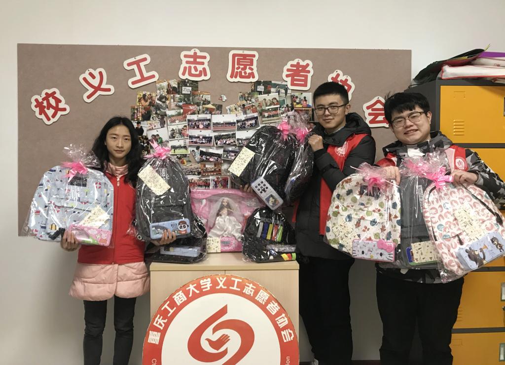 2018年12月,在收到开州区大进镇关坪完小学10名小学生的心愿清单后,校团委积极开展宣传动员,组织大学生志愿者们为孩子们征集和采购了他们所期待的心愿礼物,其中有书包、文具等学习用品,还有芭比娃娃等孩子们所期望的礼物。除此之外,志愿者们还亲手制作新年贺卡,写下了对孩子们的期许与新年的祝福。元旦节之际,校义工志愿者协会将学习用品和礼物统一邮寄到开州大进镇。1月4日,孩子们如愿的收到了来自重庆工商大学大学生们的问候和祝福。
