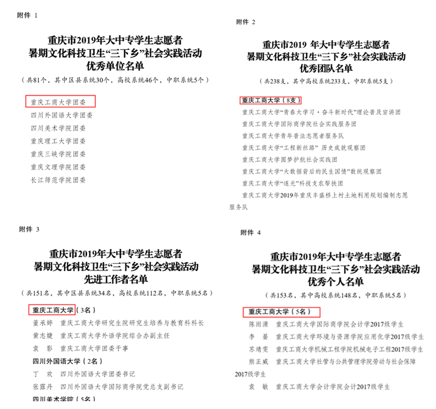 同时 ,我校获评重庆市“三下乡”社会实践活动优秀单位;圆梦护航社会实践团(经济学院)、“青春大学习•奋斗新时代”理论普及宣讲团(财经金融学院)、青年普法志愿者服务队(法学院)、“工程新丝路”历史成就观察团(管理学院)、“大数据背后的民生国情”数统观察团(数学与统计学院)、“逐光”科技支农帮扶团(文学与新闻学院)、重庆丰盛桥上村土地利用规划编制志愿服务队(旅游与国土资源学院)、重庆工商大学社会实践服务团(国际商学院)等8支团队获评市级优秀团队;董承婷(研究生院)、黄志婕(外语学院)、袁影(团委)3位老师获评市级先进工作者;陈雨潇(国际商学院)、李晏(环境与资源学院)、苏靖雯(机械工程学院)、熊正威(社管与2003网站太阳集团)、袁敏(会计学院)5位同学获评市级先进个人。