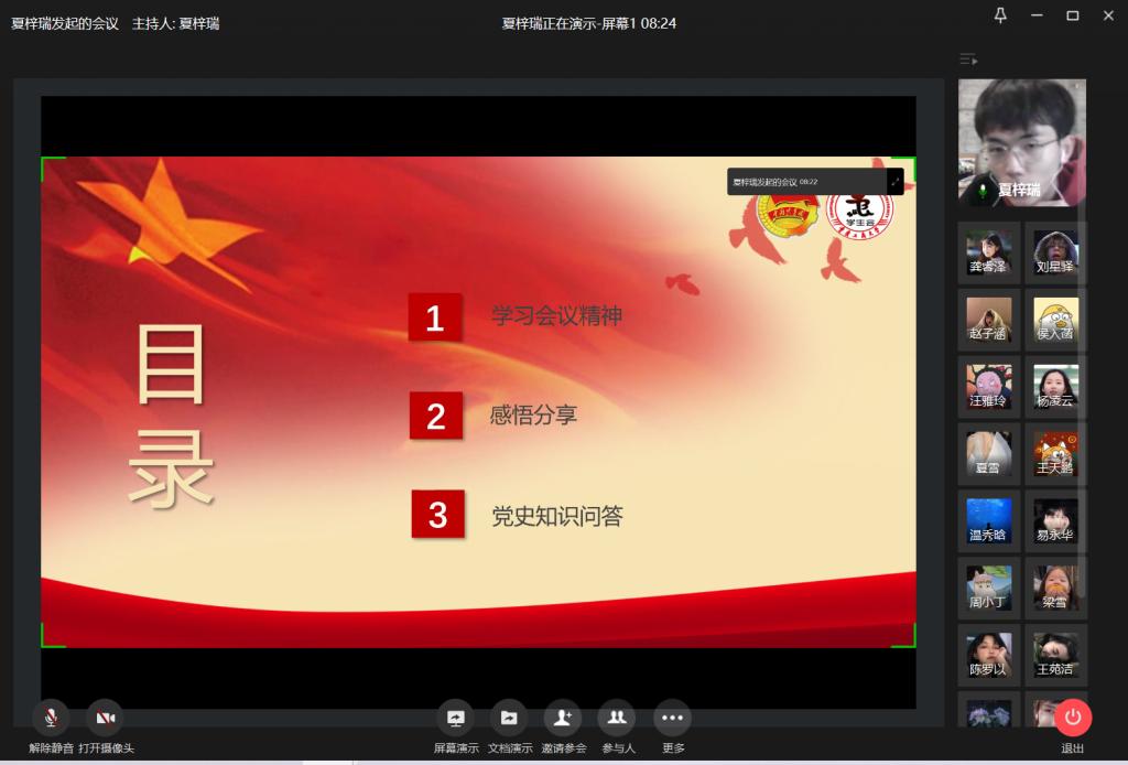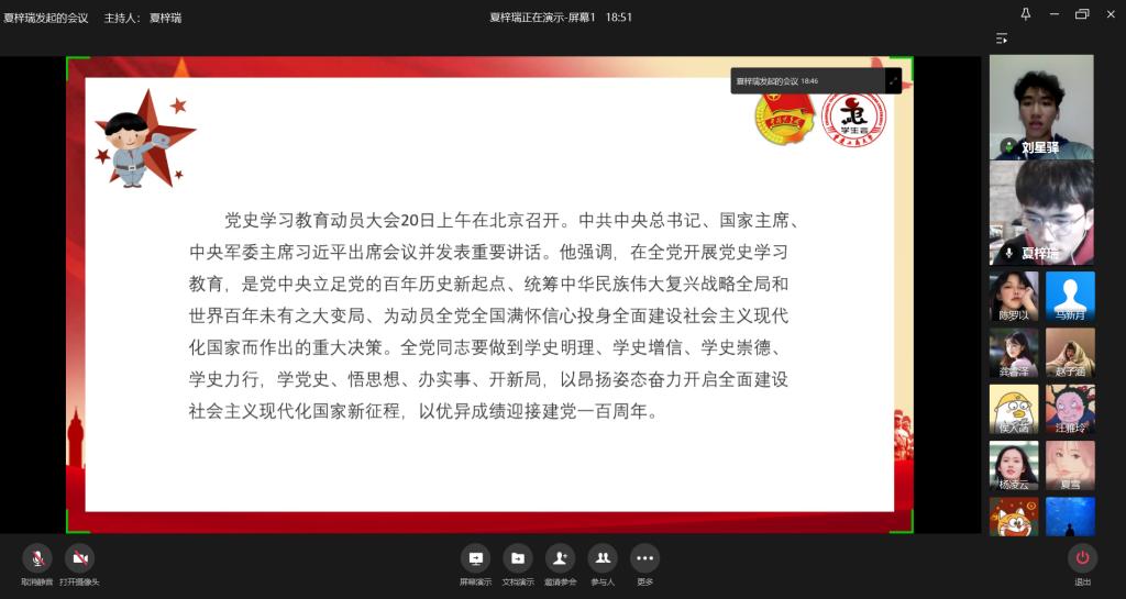 为学习习近平总书记在党史学习教育动员大会上的重要讲话,推动学生骨干深入学好党史、新中国史、改革开放史、社会主义发展史,提升团学干部的政治素养,我校学生会于2月23日晚通过企业微信平台开展“学党史,悟思想”线上学习交流会。本次线上主题学习交流会由校学生会主席团成员夏梓瑞主持,20余名学生会骨干成员共同参与。