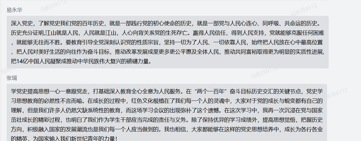 会议最后,由夏梓瑞主持党史知识问答环节,夏梓瑞提问西楼会议别名、中美关系正常化进程的开始日期等问题,与会同学于企业微信聊天界面抢答,同学们都积极参与,争相竞答,气氛活跃。
