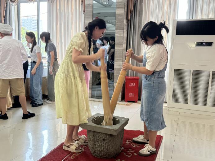 活动开始前,后勤处饮食科请来专业面点师,为大家详细讲解打糍粑的步骤和注意事项。石臼中糯米粒粒晶莹、热气腾腾,米香氤氲,师傅一边舂打糍粑,一边给同学们介绍:“这打糍粑很有讲究,动作、速度和力量缺一不可。”接着,在师傅的悉心指导下,同学们积极踊跃参与其中。大家热情高涨、充满期待,通过团队合作,一颗颗糯米逐渐变为软黏的糍粑,现场洋溢着热闹欢乐的氛围。在这一过程中,同学们共同体验了打糍粑的乐趣。管理科学与工程学院2023级工程管理专业杨政杰同学说到:“在紧张的学习生活中,能够拥有这样一段与同学们共同度过的美好时光,倍感温馨和幸福。这不仅是一次糍粑制作的体验,更是我们共同编织的文化记忆,让我们对中秋节的传统习俗有了更加生动和深刻的理解。”活动结束后,同学们拿着自己亲手制作的糍粑成品共同合影留念。